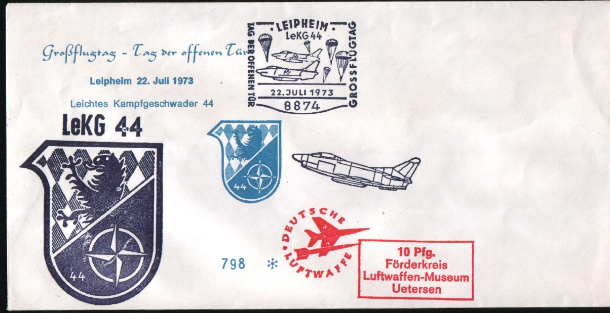 Am 22.Juli 1973 veranstaltet das Geschwader einen Großflugtag, den über 100.000 Zuschauer erleben. Damit verabschiedet sich das LeKg 44 von Leipheim. U.a. waren eine Formation von 16 Fiat G-91 zu sehen, aber auch die „Patrouille de France„ mit Fouga Magister konnte bestaunt werden. Auch 1973 gewann man den „Sharp-Shooter„ Wettbewerb zumindest in der Mannschaftswertung (Maj. Kurz, Maj. Hartl, Hptm. Fey, Hptm. Berns), 1974 war dies ebenso der Fall (OLt. Hermanns, Maj. Wronowsky, Hptm. Gebauer, Hptm. Fey). In allen 3 Disziplinen stellt der Verband die ersten beiden Plätze. In diesem Jahr erhält der Verband auch erstmals den Flugsicherheitspreis für das Jahr 1973 aus den Händen des Generals der Luftflotte, Generalleutnant Wehnelt.